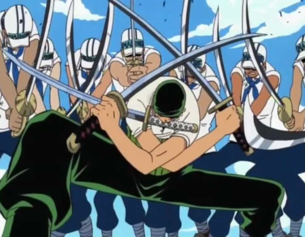 mereka dengan menggunakan pedang.Zoro meminta luffy untuk memberikan pedangnya.